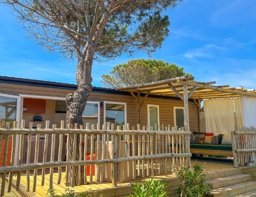 Auf dem Familiencampingplatz La Clape, einem der Top-Plätze, entspannen Sie im attraktiven Poolbereich mit Blick auf das Meer und die Küste. Um die beheizten Pools verläuft eine Sonnenterrasse mit bequemen Sonnenschirmen und Schatten spendenden Liegen. Gleich neben den Pools serviert das Team an der Poolbar frische Getränke und Snacks auf der Terrasse. Den Strand von Liscia mit feinem weißen Sand erreichen Sie nach 10 Fußminuten.